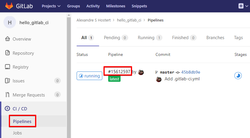 Let's go to Pipelines and see GitLab doing the job. Just click on Pipelines to find the actual running build job.