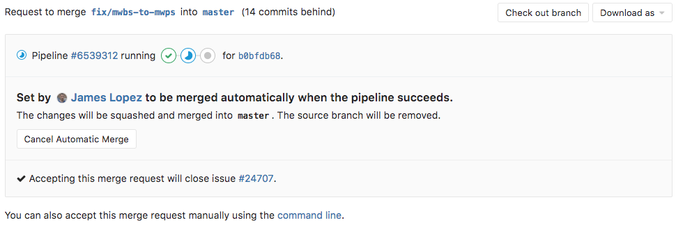 When you hit the "Merge When Pipeline Succeeds" button, the status of the merge request will be updated to represent the impending merge. If you cannot wait for the pipeline to succeed and want to merge immediately, this option is available in the dropdown menu on the right of the main button.